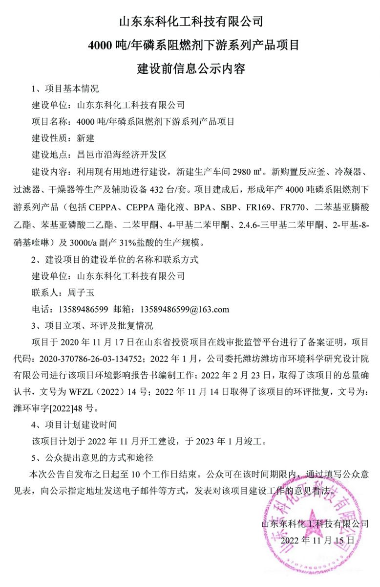 开云官方注册地址4000 吨/年磷系阻燃剂下游系列产品项目建设前信息公示